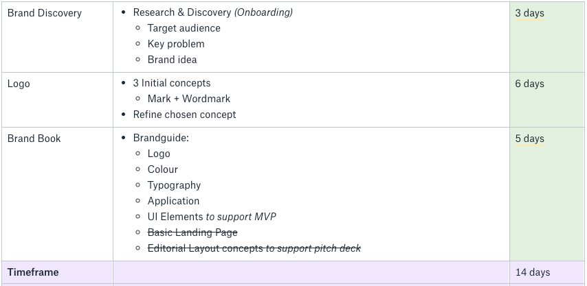The next step was to engage Rosie Manning (who brought in Liam Bush & Damian Kidd to assist) to take my initial brain dump and turn it into a brand / style guide. Here's the scope that we agreed for the project: