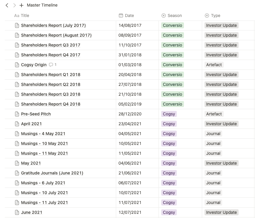 I also regret the seasons in which I didn't write as much and when my journaling habit fell by the wayside. This is especially true for the most recent season of life where I was building Cogsy: today, I don't have a lot of additional content after late 2021 when Cogsy raised its seed round. And yet, I know there is so much of that story to be told. (The upcoming content project attempts that, though.)
