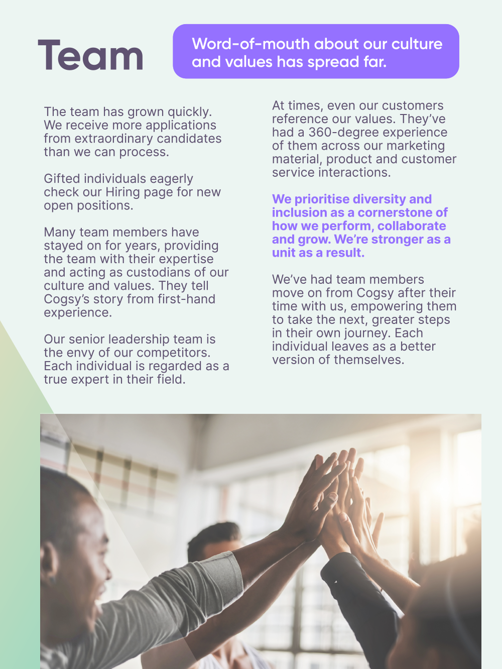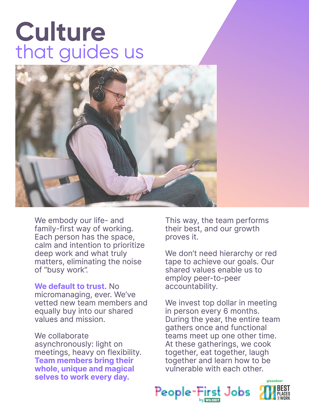 Here are two example pages from the greater document that relates to our team and culture: